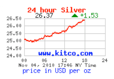 | Silver Breaks $26; Shows What A Little RICO Lawsuit Can Do To The Price Of A Manipulated Commodity Posted: 04 Nov 2010 05:21 AM PDT Silver hits a new all time record: $26.03 (except for that whole Hunt bros reverse manipulation thing). It is simply AMAZING what a little RICO lawsuit filed against JPM and HSBC will do. How about a 5% price increase in a day? And for all those patting themselves on the back for what the Fed's dollar debasement is doing to their stock portfolios, perhaps the fact that the S&P is now down 29% YTD priced in silver should be a Zimbabwean wake up call. And you ain't seen nothing yet. The LBMA (but mostly JPM and HSBC) are bracing for a tsunami of margin calls after the close. |