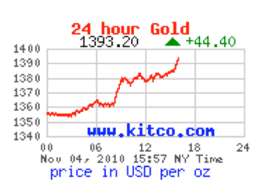 | Posted: 04 Nov 2010 10:18 AM PDT Gold futures soar to new highs The COMEX December gold futures contract closed up $45.50 Thursday at $1383.10, trading between $1346.70 and $1384.80 November 4, p.m. excerpts: |