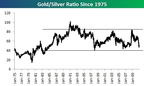 Is Silver Getting Overbought vs. Gold? Posted: 11 Dec 2010 08:10 PM PST Kurt Brouwer submits: When comparing gold to silver in terms of value, one good tool is the gold - silver ratio, which compares the price of an ounce of gold to an ounce of silver. There have been wide swings in the ratio over the past 10 years, with the ratio of gold getting as high as 80 times an ounce of silver with a low approaching 40 times, as this charts demonstrates: Source: Bespoke Investment Group Complete Story » | |