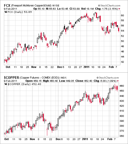 Freeport McMoran: How It Trades Against Copper Posted: 11 Feb 2011 07:59 AM PST Zecco submits: By Richard Bloch I forgot who was discussing it, but someone on CNBC’s "Fast Money" was suggesting that copper and gold miner Freeport McMoran (FCX) doesn’t seem to be trading well. After all, copper itself has surged to new highs, but as of February 9, Freeport is off more than 10% from the 2011 high of about $61 (adjusted for the 2:1 split on February 2). It gapped down after its January earnings report as you can see on this chart: | ||