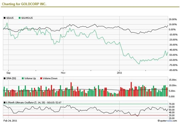 | A Leverage Strategy for Goldcorp as Bull Run Seems Likely Posted: 28 Feb 2011 07:58 AM PST Marco G. submits: With the indications of a new Bull run for precious metals starting, it is time to examine the Gold miners to see which ones may offer the best opportunities. This author has not been a fan of the large Gold companies recently and has been particularly critical of Goldcorp (GG) after last year's purchase of Andean Resources. However, it seems that there may be a recent market anomaly involving the glamour boy - Goldcorp - that readers may be interested in. The situation may offer a way to profit from Goldcorp in the current run of the Gold bull. Goldcorp Status In the chart following, the black trace is Goldcorp's (GG) share price since September 2010, and the green trace are Goldcorp's warrants with a strike price of $45.75 that will expire June 9, 2011.