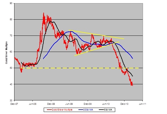 | Posted: 24 Mar 2011 08:05 AM PDT Hard Assets Investor submits: Real-time Monetary Inflation (last 12 months): 2.2% A couple of weeks ago, we said we'd get back to you when the gold/silver ratio hit a 37-to-1 objective ("What's Next For The Gold/Silver Ratio?"). Well, it hasn't happened yet. I mean, the ratio—basis London spot—has dipped. On March 10, the date our feature was published, gold's price multiple (PM) was 40.5x. When the metals' prices were fixed on March 23, the multiple had slid to a new low of 39.2x. Gold/Silver Multiple (Click charts to enlarge) The downward trajectory of gold's price multiple has been essentially stalled, giving up inches grudgingly. That's not surprising, given the terminal phase of its decline. We're talking about giving up only two more handles for this phase to play itself out. The slowdown's largely due to the "risk off" switch being pulled recently. The gold/silver trade—that is, trading silver on the long Complete Story » |