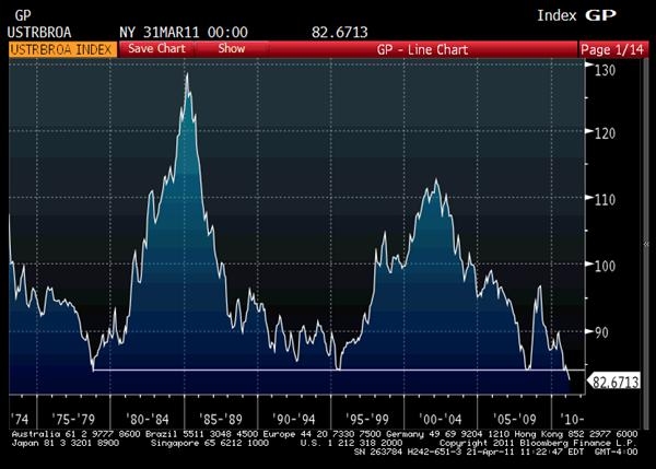 | Investors Pile Into Precious Metals; Price of Lumber Plummets Posted: 21 Apr 2011 04:27 PM PDT Pater Tenebrarum submits: The combination of continued trouble in euro area peripheral sovereign debt and a weak US dollar has resulted in continued buying interest in precious metals. Silver is on a near-parabolic run, quoted at over $46/oz. as of the time of writing. Gold has in the meantime established a foothold above $1,500. Gold as of Wednesday's close – first time above $1,500 – click for higher resolution. Silver's incredible rally continues – this was Wednesday's close – as of early afternoon on Thursday it trades another $1 higher at $46.28 – click for higher resolution. The US dollar continues to sink – but it is close to major long term support levels here – click for higher resolution. The Fed's broad trade-weighted dollar index meanwhile is at a new 40 year low – click for higher resolution. Some Warning Signs On The Horizon Jon Hilsenrath, the Fed's mouthpiece at the WSJ, Complete Story » |