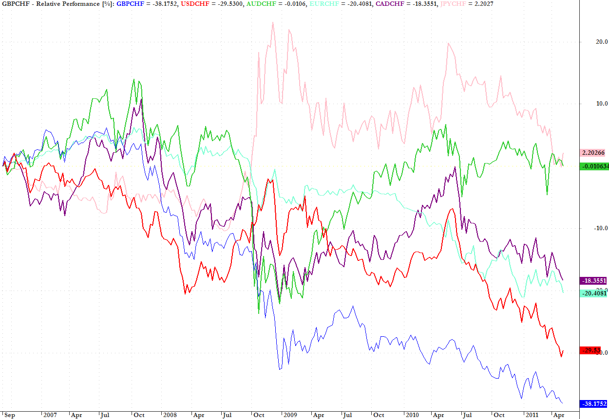 | GBP/CHF the Clear Loser Over Last 4 Years Posted: 09 May 2011 02:38 AM PDT Clive Corcoran submits: Measuring the relative strength of various currency pairs can be done using a separate benchmark such as determining the price of gold for each currency, and then creating an index to see how much more or less the gold price in that currency is now, rather than it was priced at the base period for the index. [Click to enlarge] The method chosen to prepare the chart above is simply to contrast the current relative performance of six major currency pairs, each with the Swiss franc as the base currency. The starting period chosen is the end of July 2007, which marked an important inflection point for most FX pairs. The results clearly show that GBP/CHF is the weakest pair, and as of the May 6 closing price, sterling is 38% less valuable against the Swiss franc than it was at the end of July 2007. The other results are Complete Story » |