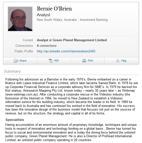 Good old feline Bernie, cautiously combining candour with innuendo, and fishing for another upfront fee at the end there, from someone who just wants their money back from the last scam, executed by Bernie's reps in the UK. I hope the mark didn't give Bernie even more money. But scam victims do sometimes fall for a follow-up "money recovery" scam, as Bernie knows; which is why he is fishing. Tip to these very confused victims: Barrell and O'Brien are both crooks. As for Mr Ali Pourtahari, I would ignore his resumé and give him a wide berth, too. That isn't quite the end of Bernie. He seems to be quite adept at making himself look respectable. Here he is at a 2009 seminar at the Converga Green Economy Hub (page 2, 14:00). Bernie's subject is "Making Your Green Idea a Success". A success for whom, one naturally wonders. At that seminar, he is sharing a public platform with Anne Maree Huxley, CEO of the Aussie green sustainable industry body MOSS, who need a big loud wakeup call about Bernie. Here is the last page of Bernie's predictably banal seminar presentation (I will spare you the rest of it), with the names of some more people who could do with a big loud wakeup call. All of which leads us to Bernie's next vehicle, Green Planet Management. His LinkedIn profile proclaims him to be an analyst there (and we note that he owns at least three shirts): Oh, I should have asked the Australian Bar Association to confirm that Bernie O'Brien really is a barrister. It just seems so unlikely. From Ripoff Report again: