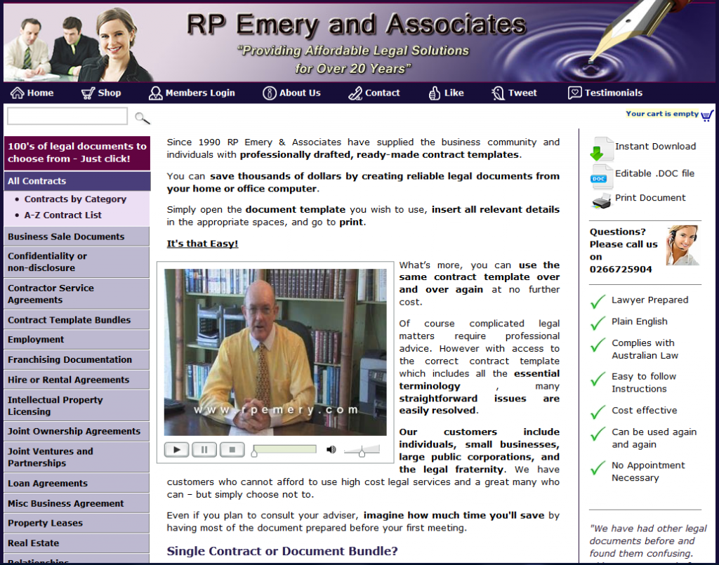 There's a vast range of different templates that people might want: business sale documents, NDAs, loan agreements, rentals, and so on and on. There's a bunch of testimonials from happy clients. It all looks rather dull. At the bottom of the home page it says: