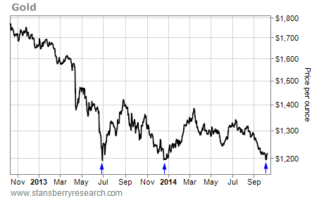 Most investors have given up on the sector. But John says this has created an enormous opportunity for investors to buy gold today. You see, there are several catalysts that should push gold and gold stocks higher in the months ahead. For starters, Europe’s economy is going through a sharp slowdown. The latest economic figures show many European nations could fall into a recession. Because of this, John says the European Central Bank (ECB) is likely to announce several more plans to stimulate the economy by printing money and keeping interest rates low – just like the U.S. has been doing. The ECB has already cut interest rates twice since June. It also announced it would be buying covered bonds and bundled bank loans. But more aggressive measures are likely on the way. This will create a huge amount of cheap money that will eventually result in higher inflation. And even the hint of higher inflation could push gold prices – and gold stocks – higher as investors, worried about the devaluation of their money, pour into these assets. History also shows gold prices should jump higher soon. Earlier this month, gold prices fell to around $1,200 per ounce. Since June 2013, gold prices have fallen to around $1,200 an ounce three times. The last two times gold prices tested these levels, they jumped higher in the months ahead. You can see this in the chart below…